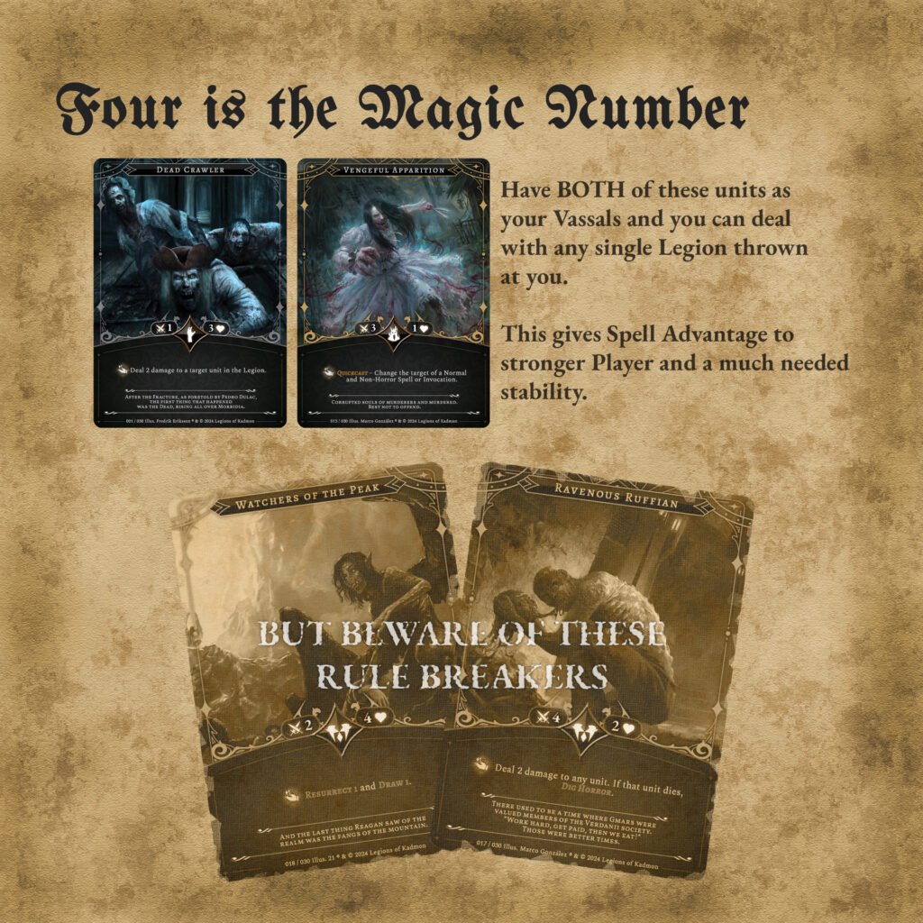 Four is the magic number. In Legions of Kadmon, four is the highest number you can see – power, life, damage, shields. No number will exceed the number four. This means that if a Player meet the number four among their Vassals can be considered a threat.