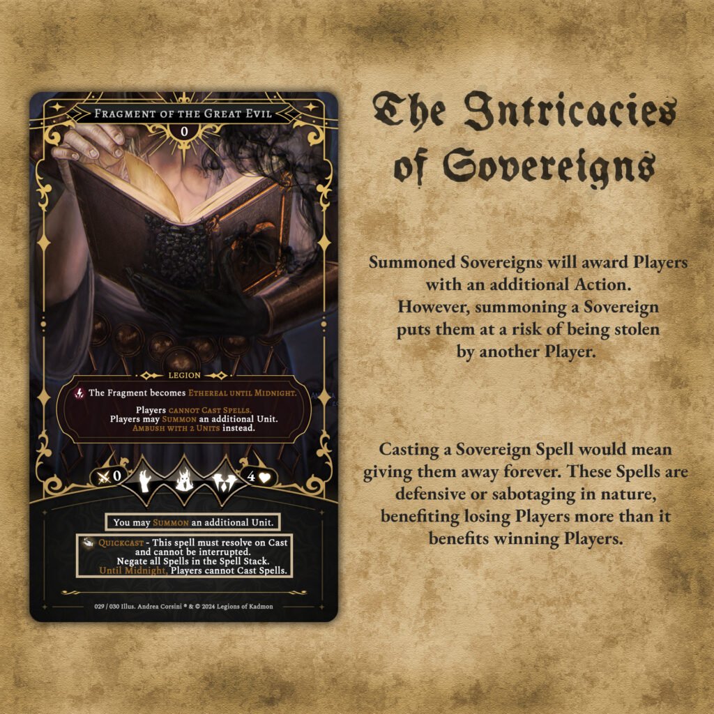 Sovereigns are something dear to my heart. They are the heart of the game, and something that I put a lot of effort into design. Throughout my time designing Legions of Kadmon, I have spent the most time making sure Sovereigns are fun to play against and with.